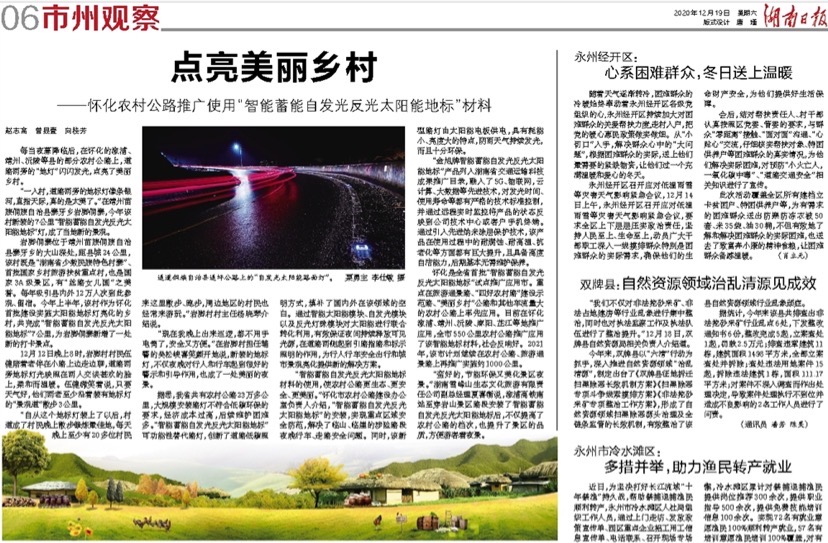 金旭科技點(diǎn)亮美麗鄉(xiāng)村--懷化農(nóng)村公路推廣使用“智能蓄能自發(fā)光反光太陽(yáng)能地標(biāo)”材料每當(dāng)夜幕降臨后,在懷化的溆浦、靖州、沅陵等縣的部分農(nóng)村公路上,道路兩旁的“地?zé)簟遍W閃發(fā)光,點(diǎn)亮了美麗鄉(xiāng)村。